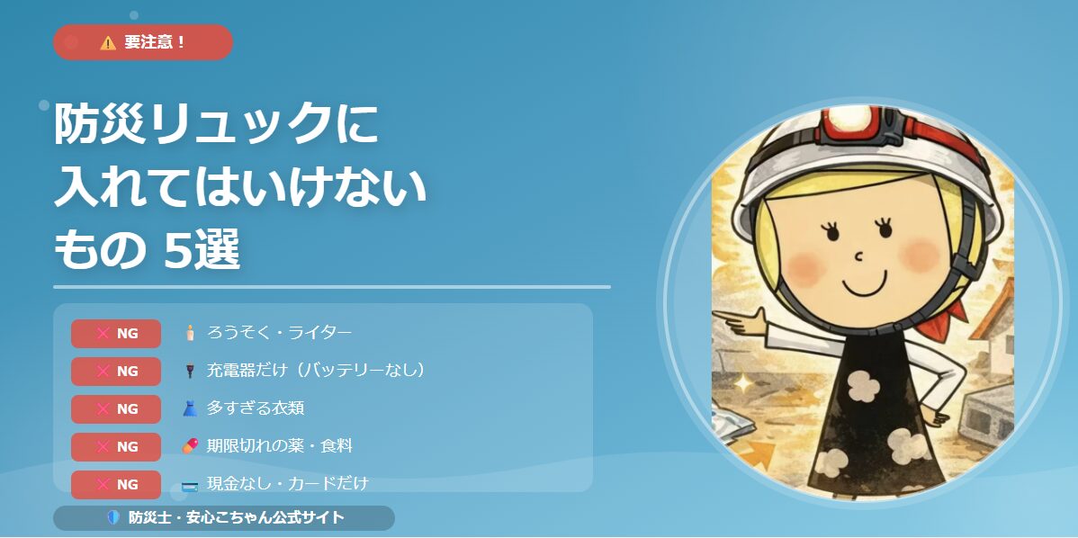 防災リュックは「何を入れるか」より「何を入れてはいけないか」を知ることが大切です。