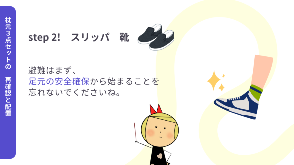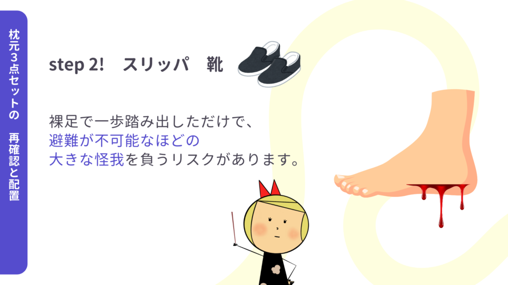 - 底の厚いスリッパ、または運動靴を寝床の横に