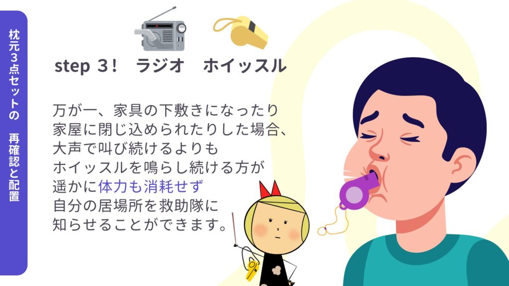 最低限必要なのは、懐中電灯(またはヘッドライト)、靴(スリッパ)、ラジオ・ホイッスルです。この3点があるだけで、夜間の初動行動が大きく変わります。