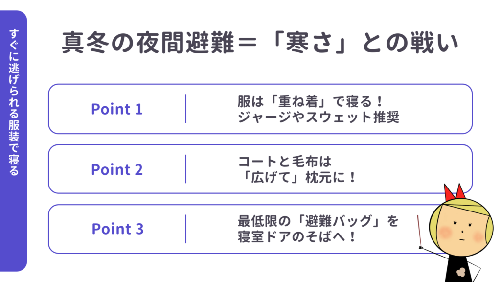 そのまま外に出られる服装で寝ることが命を守ります。