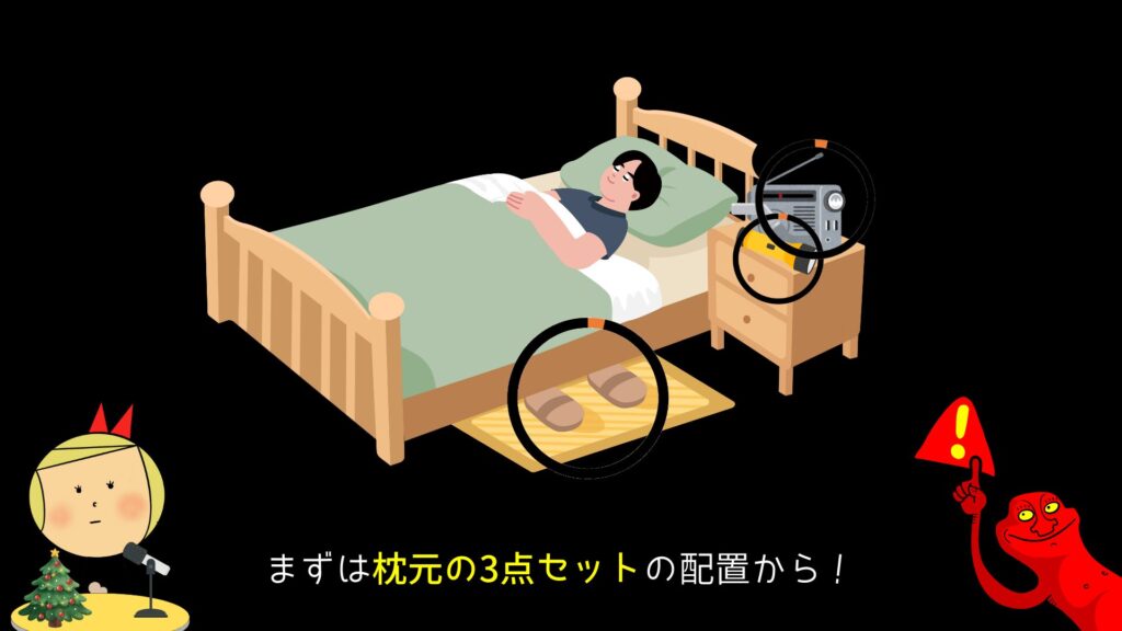 - 水・食料・薬・貴重品など最低限を寝室に